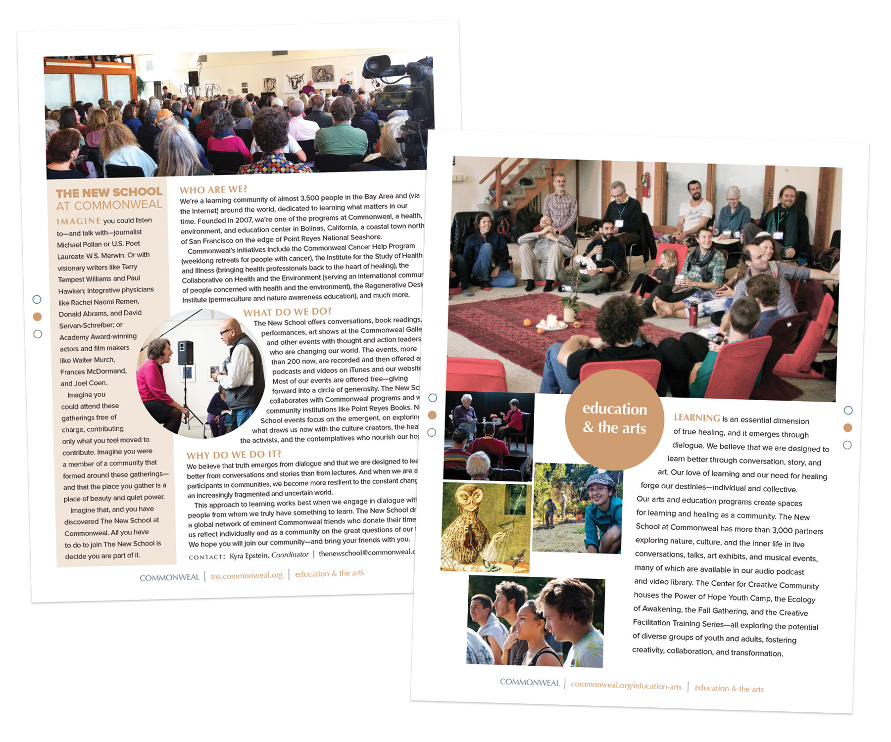 Commonweal called on Acme to solve the problem of too many program flyers with no consistency. We created a full-color magazine clarifying the categories, consolidating segments for cohesiveness, while still functioning as stand-alone pieces.